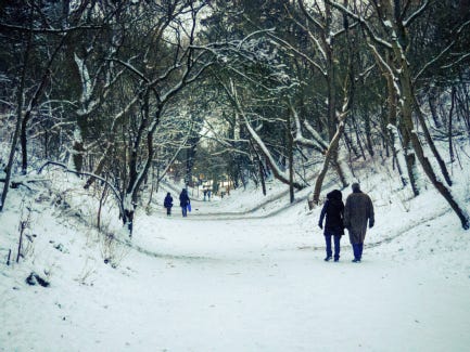 And how beautiful their kingdom seemed to them all on that cold, sparkling day. The round topped, snow-sprinkled hills spread out in all directions, clambering up toward the Sierra. The sky, a cloudless blue-white, arched its endless, kind roof over oaks, pine and madrone from valley to peak. Sunlight as pale as fireweed honey poured over them as they followed the path forward.
